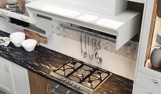 Кухня на заказ с открытыми верхними полками – подходящее решение для небольших помещений. Подобные модели позволяют сохранить воздушность и свет, не перегружают помещение. При этом на полках удобно хранить высокие емкости, стопки тарелок и банки со специями.