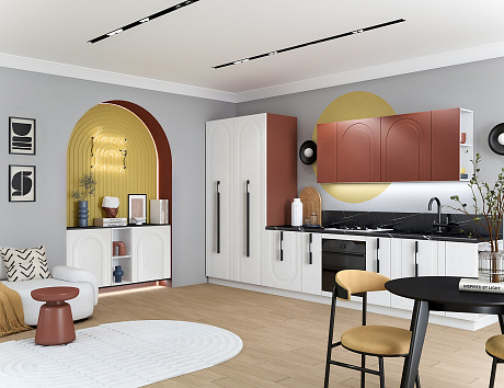 • Арочная фрезеровка фасадов кухни Арко Атриум — не просто декор, а стилистический код, в котором зашифрованы вечная красота и гармония. Её изгибы создают рельеф, в котором играет свет, а тени оживляют поверхность, превращая ее в часть живого пространства. Контрастный терракотовый верх фасадов словно напоминает о закатах над морем, а спокойный матовый низ оттеняет его, создавая баланс и глубину. Кухня становится не только зоной для приготовления еды, но и настоящей архитектурной доминантой интерьера.