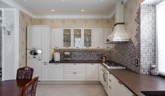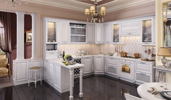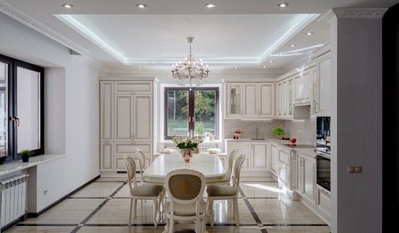 Для просторной квартиры с большими окнами и высокими потолками подойдет классическая белая кухня. Модель такого типа можно узнать по симметричным линиям, простым формам и роскошному декору. Фасады кухонной мебели в стиле классика оформляют лепниной, позолотой, резными узорами, патиной.