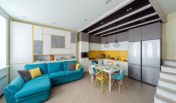 Большая площадь позволяет комбинировать белый цвет с яркими или темными расцветками. При выборе дополнительного тона учитывается интенсивность дневного освещения в помещении. Если в него попадает много солнца, дизайнеры рекомендуют использовать черный, коричневый, темно-серый, бордовый, синий и малахитовый. С помощью этих оттенков можно сыграть на контрасте, подчеркнув красоту светлых фасадов.