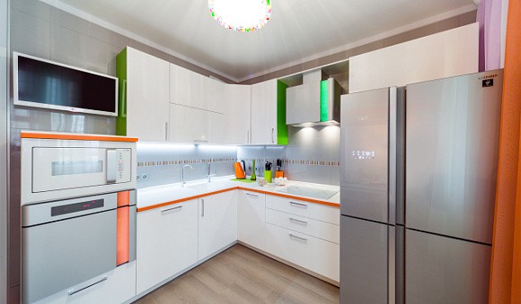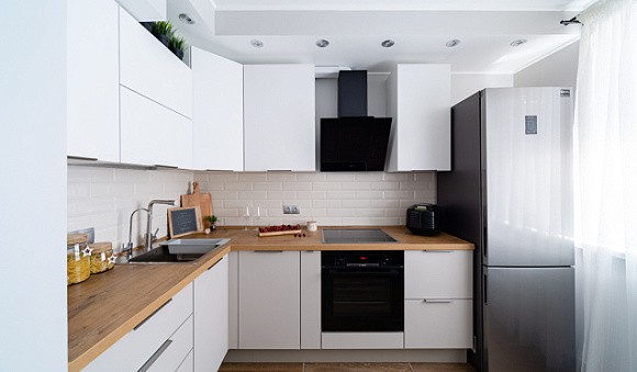 Версия с белыми фасадами идеально встроится в компактную комнату. Подобный кухонный гарнитур в сочетании со светлыми стенами, полом и потолком позволит добиться визуального расширения пространства. Происходит это благодаря тому, что белоснежные поверхности отражают солнечные лучи, увеличивая количество света в комнате. Особенно хорошо этот эффект работает с глянцевыми текстурами.