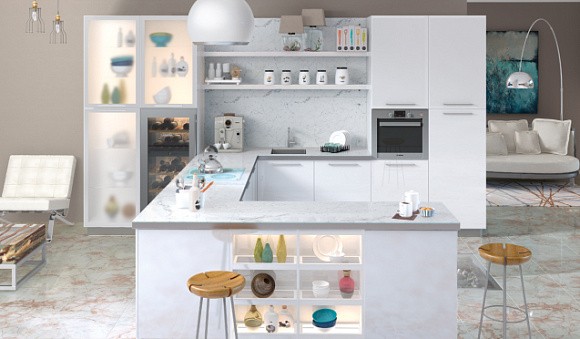 Кухонный гарнитур белого цвета с барной стойкой выглядит очень интересно и оригинально. Такой комплект можно подобрать для помещения любого размера. Выбор зависит от конструкции стойки. Складная версия подойдет для небольшой комнаты, так как после использования ее можно будет убрать, освободив место. Барные стойки стоящие отдельно используются в качестве дополнительной рабочей поверхности или стола и подходят для просторных комнат.