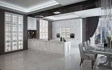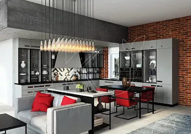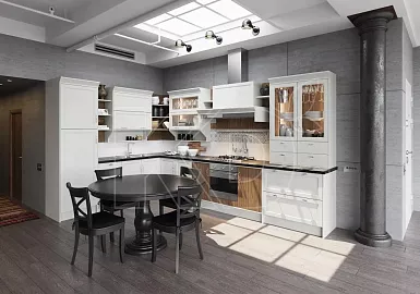2. Размер. Мебель размещается в больших столовых и поэтому имеет большие размеры. Планировка - П-образная или квадратная, обычно с островом. Кухонные гарнитуры более сложные и часто имеют барную стойку или витражные шкафы. Дешевые модели обычно меньше по размеру и имеют линейную планировку.