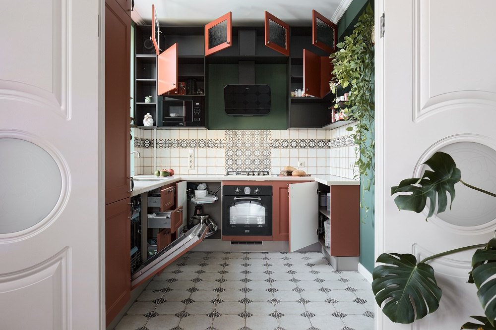 Высота полок внутри шкафов напрямую влияет на удобство хранения. Стандартом считается 25–30 см — этого достаточно для большинства тарелок и банок. Но если семья активно использует высокую кухонную утварь, кастрюли или бытовую технику, дизайнер всегда может подобрать правильные размеры кухни, изменив этот показатель. Таким образом, каждая полка становится функциональной и соответствует привычкам семьи.