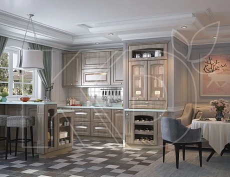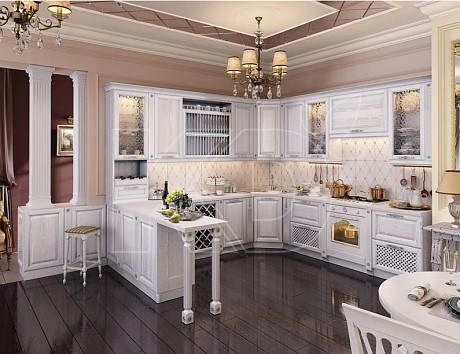 Классическая кухня обладает легко узнаваемыми чертами. Такая мебель спроектирована в строгом соответствии с требованиями симметрии, а для ее изготовления используются массив, шпон благородных пород или стилизованные под натуральное дерево современные материалы, такие как экомассив или экоплиты. Фасады гарнитуров украшает сложная фрезеровка, резные карнизы, колонны и балюстрады, для оформления часто служит лепнина, витражи из матированного стекла, решетки фигурных форм, инсталляции из кристаллов Swarovski.