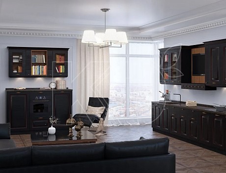 В традиционном варианте мебель выполнена в сдержанных лаконичных тонах: белом, коричневом, черном, бежевом. Чтобы внести яркий акцент в оформление гарнитура, нередко используется золотистая или серебристая патина, подчеркивающая антикварный вид фасадов. Такой строгий и респектабельный вариант обычно выбирают люди, склонные к консерватизму и желающие продемонстрировать свой высокий статус и безупречный вкус.