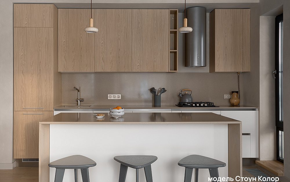 Кварцевый агломерат, искусственный камень, керамические столешницыи столешницы из пластика высокого давления (HPL-пластик) разработаны специально для активной жизни: они уверенно держат удар, не впитывают красящие жидкости (вино, соевый соус, томатная паста) и максимально неприхотливы в уходе. Такие поверхности легко переносят ежедневную готовку, детские гастрономические эксперименты и семейные ужины, оставаясь аккуратными и эстетичными. Это практичный выбор для тех клиентов, кто хочет, чтобы кухня выглядела безупречно не только в день установки, но и спустя долгие годы.