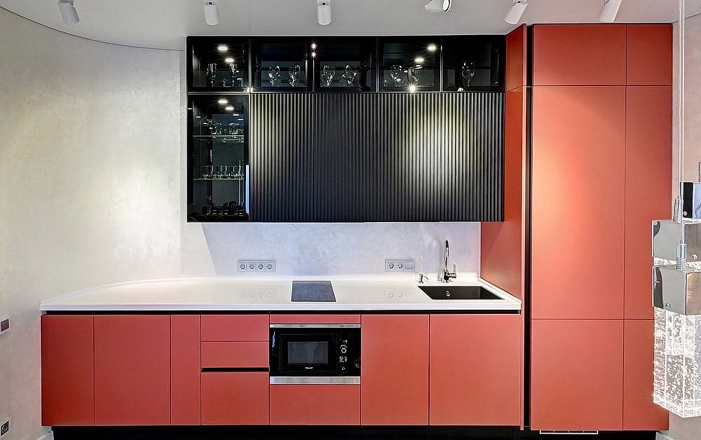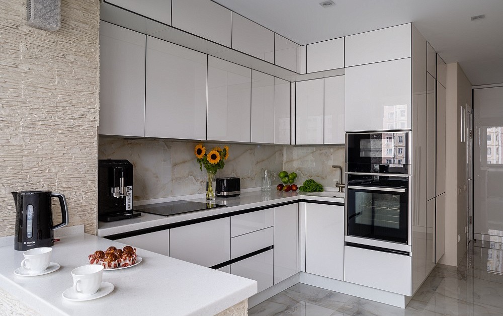 Столешница, заставленная разнообразной бытовой техникой, смотрится довольно неряшливо, особенно в небольших пространствах. Поэтому кухонная мебель со встроенной техникой выглядит гораздо привлекательнее. Спрятать за фасадами можно не только крупные предметы – вытяжку, духовой шкаф, посудомоечную машину, холодильник. Более мелкую технику, например, кофемашину, мультиварку и тостер тоже можно скрыть от глаз. Благодаря этому рабочая поверхность всегда будет выглядеть свободной и аккуратной.