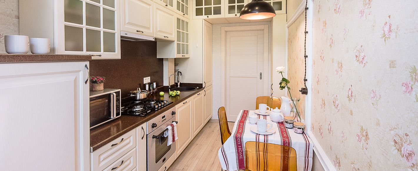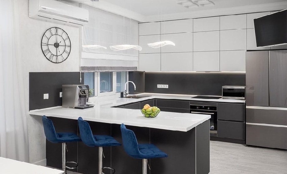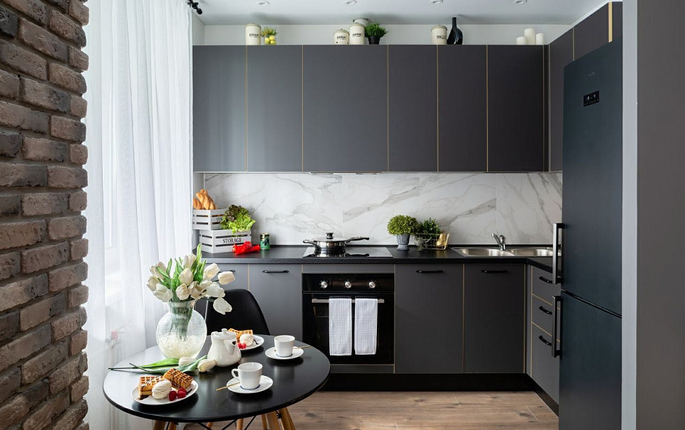 Данное правило в первую очередь касается параллельной и П-образной планировки. Для свободного перемещения между модулями потребуется расстояние 1,2-1,5 метра. В противном случае будет неудобно открывать дверцы шкафов и духовок.