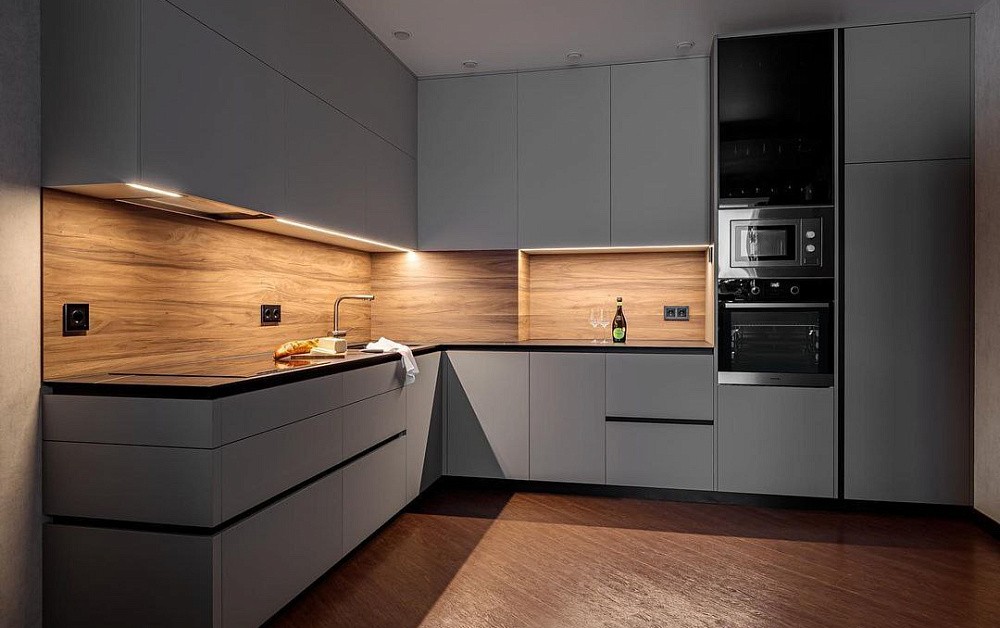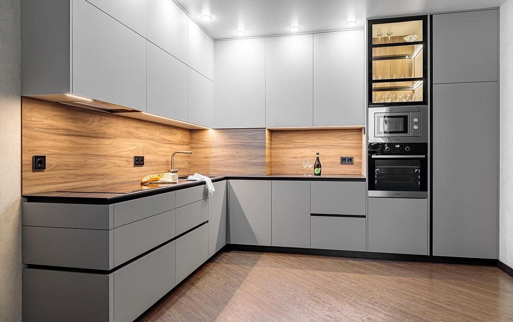 Если стены кухни не позволяют установить стандартный комплект мебели, рекомендуем заказать кухню по индивидуальным размерам. В этом случае дизайн-проект будет реализован с учетом особенностей помещения. Например, ниши будут использованы для установки полок и бытовой техники.