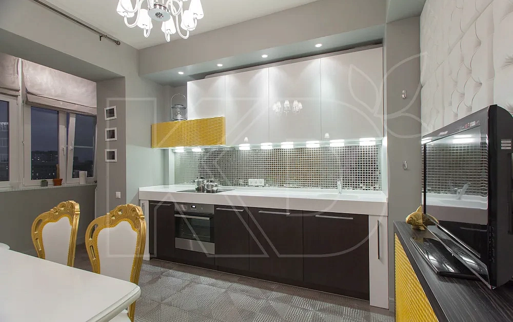 Для проходной прямоугольной комнаты лучше купить кухню в два ряда. Шкафы такого гарнитура выстраивают вдоль двух стен друг напротив друга, оставляя межу ними проход не меньше 1,2 метра. Такое расстояние обеспечит комфортное перемещение и не создаст неудобств во время открывания дверец.