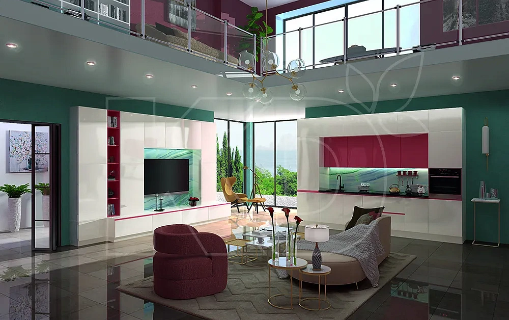 В просторных квартирах-студиях и отдельных помещениях площадью от 12 квадратных метров часто используют островные комплекты. Модули при такой планировке устанавливают вдоль одной или двух стен, в виде буквы П. Дополнительные навесные полки и шкафы часто размещают у окна.
