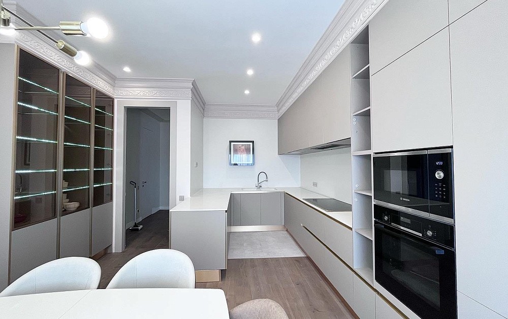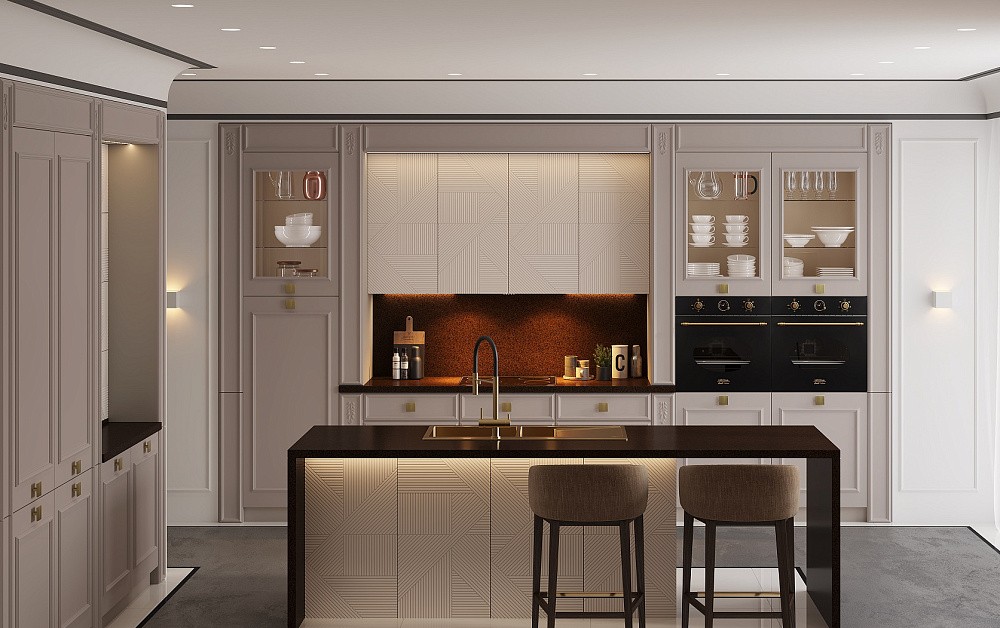 Так, для установки классической кухни потребуется большая площадь. Комплекты в стиле классика отличаются роскошной отделкой в виде позолоты, резьбы, лепнины, патины. Исходя из этого, для оформления стен и потолка следует использовать соответствующие элементы – многоярусные люстры, картины в резных рамах, дорогие обои с теснением и шелкографией. Напольное покрытие может быть каменным, деревянным или из искусственных материалов высокого качества.
