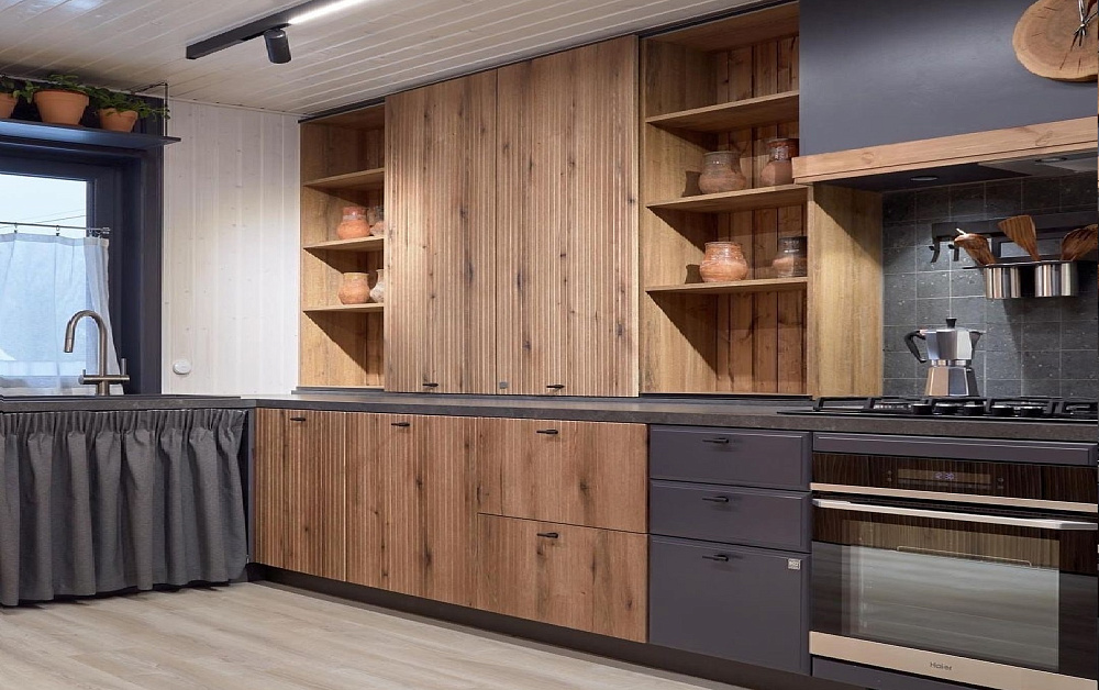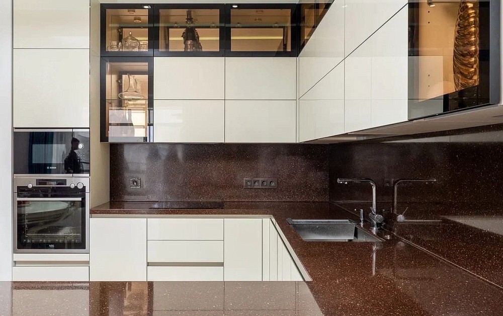 Для комнат с внушительной площадью можно подобрать темную или, наоборот, яркую кухню. В помещениях на южной стороне допускается установка графитовых, шоколадных, вишневых и темно-зеленых комплектов. Более смелый вариант – модель черного цвета.