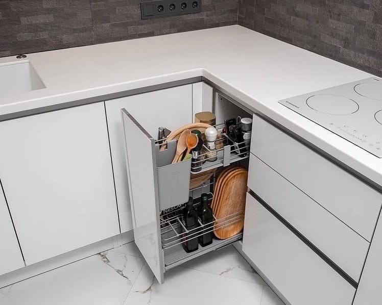 Угловая кухня – идеальный вариант для среднего по размерам помещения. При такой планировке шкафы устанавливаются вдоль двух смежных стен. В образовавшийся на их стыке угол устанавливают дополнительный шкаф, полку или раковину.