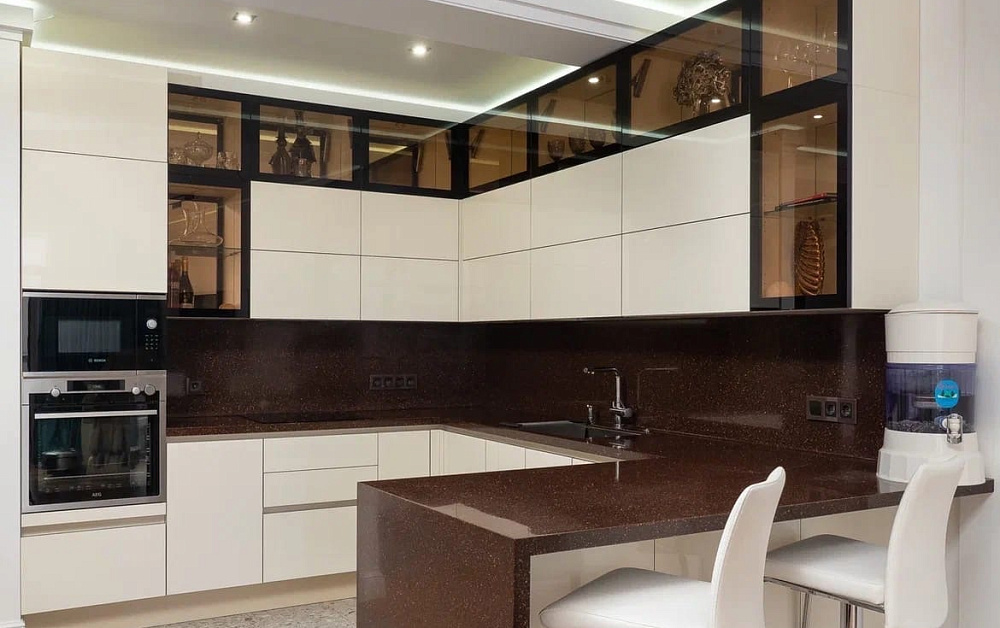Фасады с матовыми или прозрачными стеклами смотрятся интересно и дорого. Необязательно использовать их в большом количестве. Для бюджетного решения достаточно двух-трех остекленных дверец, зато пространство будет выглядеть гораздо наряднее.