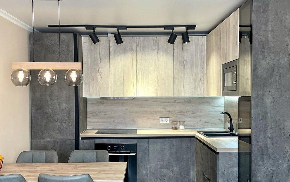 В небольших комнатах с цветовой палитрой особо не разгуляешься. Как правило, для таких пространств выбирают бежевые, белые и другие светлые оттенки. Но это не значит, что кухня должна быть унылой и монотонной. На помощь придет умеренное применение модных расцветок – черного, антрацитового и темно-серого. Использовать эти цвета можно для отделки цоколей, фурнитуры, открытых навесных полок.