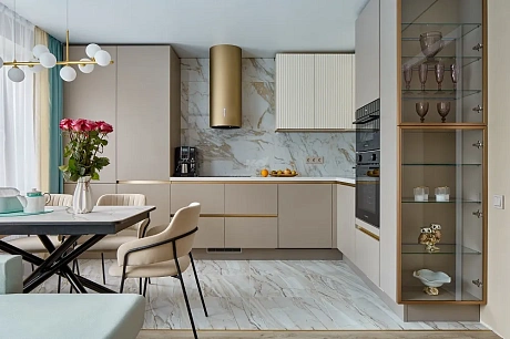 В больших квартирах часто объединяют кухню с обеденной или гостиной зоной, чтобы пространство выглядело свободнее и светлее. Диван, мягкие кресла или полноценная столовая группа помогают создать уютный уголок для отдыха, семейных ужинов и общения с друзьями, превращая кухню в настоящее сердце дома.