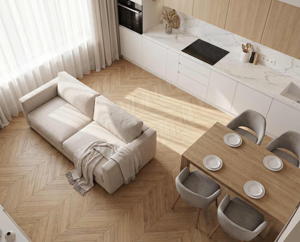 Эти приемы помогают сделать дизайн кухни с гостиной более структурированным и уютным.