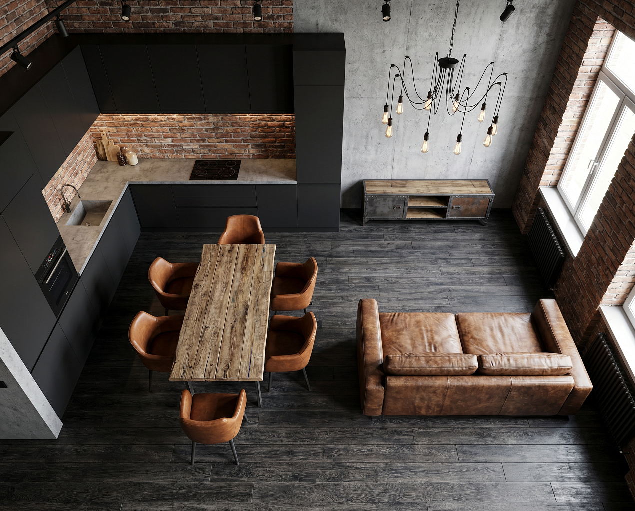 • Лофт — открытые трубы, металл, бетонные поверхности.