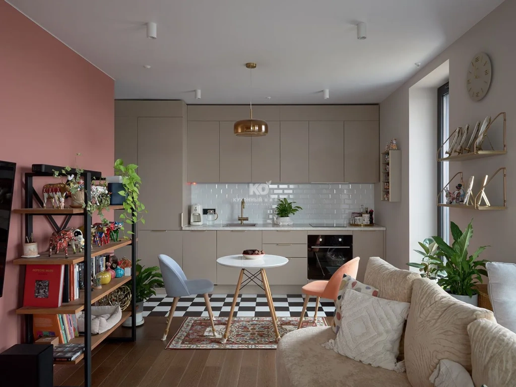 • Комната становится визуально просторнее. Даже небольшие квартиры кажутся больше и воздушнее, когда кухня и гостиная объединены.
