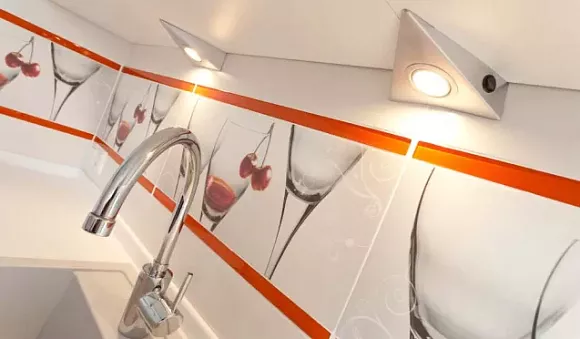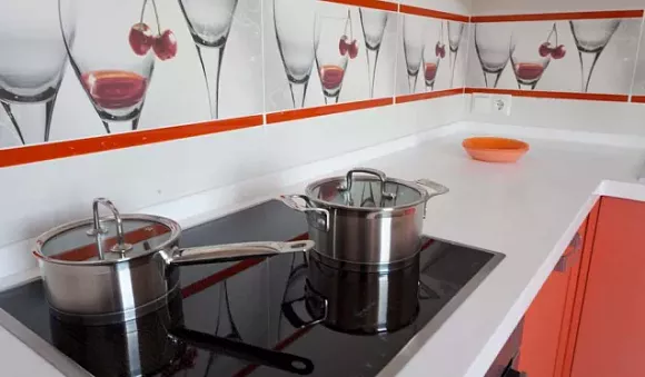 Довольно интересным и креативным решением будет использование стеклянного фартука с фотопечатью в нейтральных и приглушенных тонах. Можно будет реализовать самые разные идеи, например, напечатать оливки или фрукты, городской пейзаж, отдать предпочтение стилю кафе и так далее. Жестких ограничений в этом случае не. Главное не использовать кричащие и яркие принты, чтобы акцент всё же оставался на переливающейся кухне.