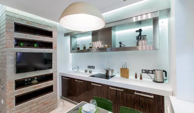 Чтобы вписать гарнитур металлик в стиль лофт, стоит воспользоваться некоторыми рекомендациями. Например, вместо стеновых покрытий должна быть голая кирпичная укладка, которую можно выполнить в красном цвете, что идеально будет смотреться с кухней металлик. Также в лофте не нужно разделять обеденную и рабочую зону, всё должно быть едино. А наличие массивных конструкций, например, потолочной балки – это характерный признак стиля кухни лофт, например.