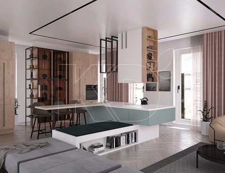В этой же ситуации можно выбрать гарнитур с барной стойкой, которая будет отделять место для приготовления пищи и заодно служить столом для подачи блюд.