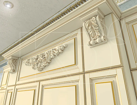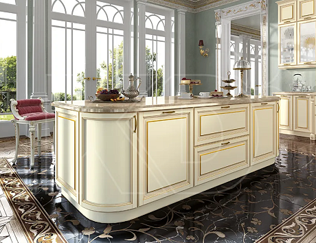 Еще одна модель – «Виконт», выполненная в дворцовом стиле. Это нарядное решение, украшенное золотой патиной и активным декором.