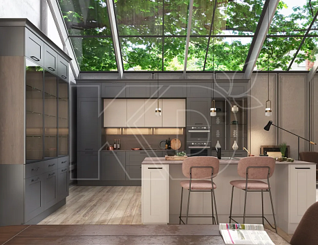 В каталоге бренда «Кухонный Двор» представлены похожие кухни в ванильной гамме. Например, модель «Стоун Грэйс». Она сочетает в себе элементы различных стилей. Фасады с классической фрезеровкой и карнизами здесь соседствуют с минималистичной фурнитурой и прозрачными витражами. В интерьере кухни пастельные оттенки сочетаются с глубокими.
