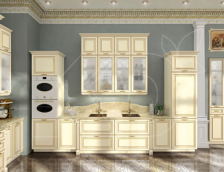 Кроме кухонь, представленных в каталоге, производитель может изготовить гарнитур ванильного цвета на заказ по созданному с клиентом дизайн-проекту.