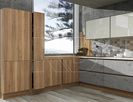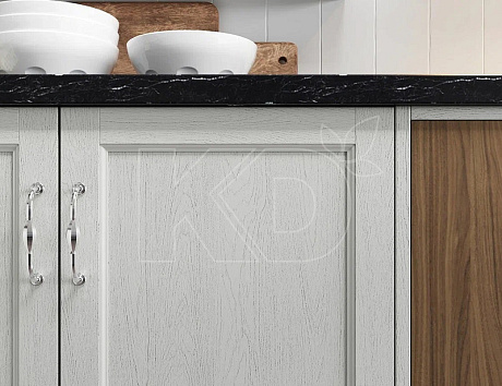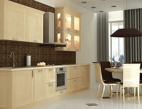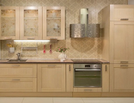 В небольшом пространстве лучше использовать природные материалы. Стены покрасить и отделать панелями из дерева. Полы на кухне уложить массивом, покрыть лаком и покрасить молочной краской. Как вариант – использовать в качестве напольного покрытия керамогранит, имитирующий натуральный камень, или ламинат.