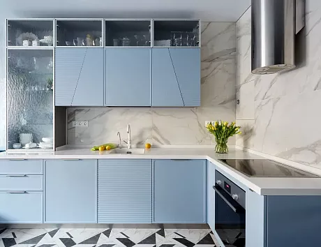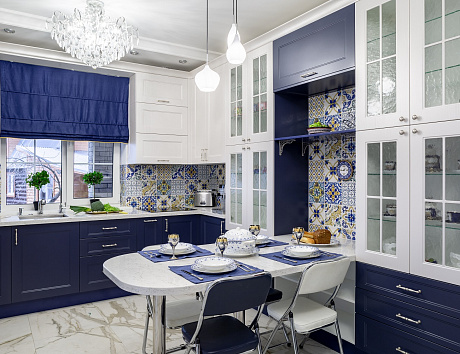 Отдельно стоит отметить то, что всем желающим сбросить вес диетологи рекомендуют активно включать синий в кухонное пространство. Считается, что этот цвет снижает аппетит, обеспечивает более быстрое чувство насыщения и удовлетворенности от еды.