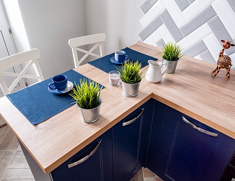 Синяя кухня с деревом