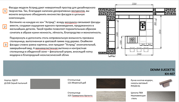 • Использование отличного качества, практичных материалов. Корпус кухни изготавливается из ЛДСП, фасады из МДФ. Отделка фасадов: экомембрана.