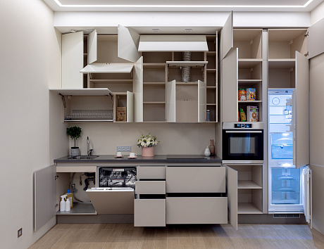 Даже если существует потребность в большом количестве зон хранения, нужно соблюдать принцип умеренности, чтобы не заставить пространство. Оставьте свободным проход между нижними модулями не менее 90 см. Используйте вертикальные решения, угловые модули, выдвижные корзины, волшебные уголки и системы хранения в цоколе пеналов. Чересчур перегруженное пространство часто мешает уборке и утяжеляет интерьер. Минимализм и функциональность — вот два главных принципа современной кухни.