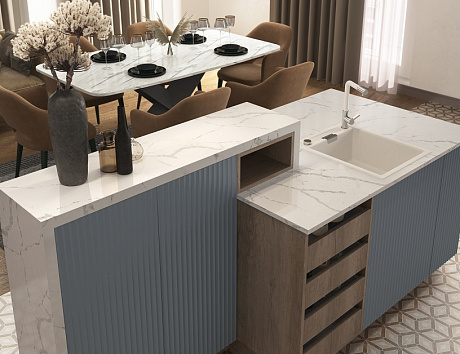 Эстетика — не единственный бонус острова. Он выступает в роли логичной линии зонирования, отделяя зону кухни от гостиной. Важно, чтобы вокруг острова оставалось достаточно места для свободного перемещения — минимум 90 см. Также заранее определите, какие функции будут интегрированы в остров: варочная панель, мойка, духовой шкаф и т.д., чтобы подвести к нему коммуникации и электрику.
