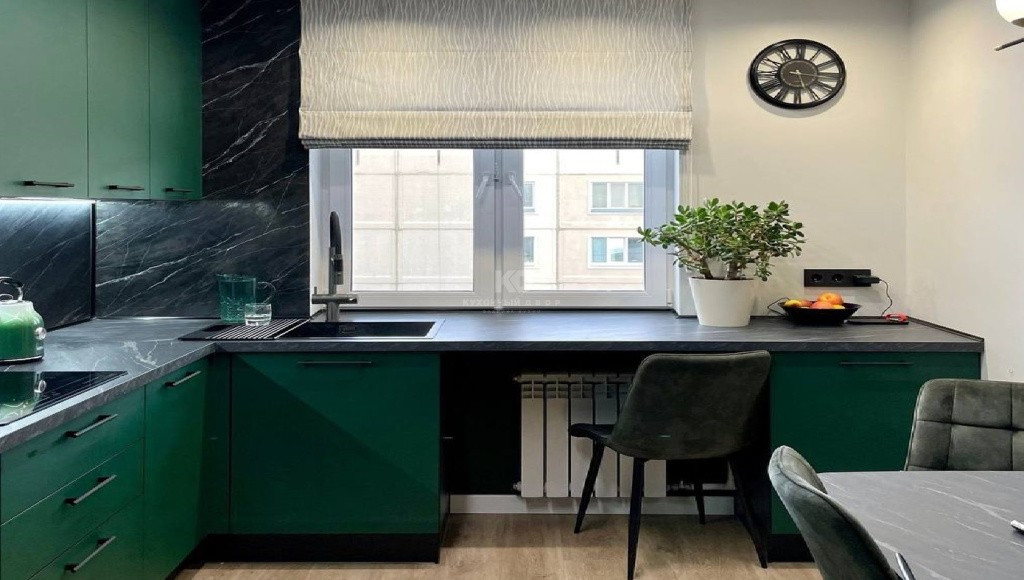 При необходимости П-образная планировка может задействовать подоконник. В таких случаях его используют как рабочую зону или дополнительную полку для хранения.
