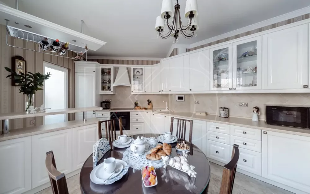 Для большей вместительности верхний ряд модулей белого комплекта делают двойным. В шкафах под потолком хранят банки для солений, праздничные сервизы и другие предметы, которые не требуются для ежедневного пользования.