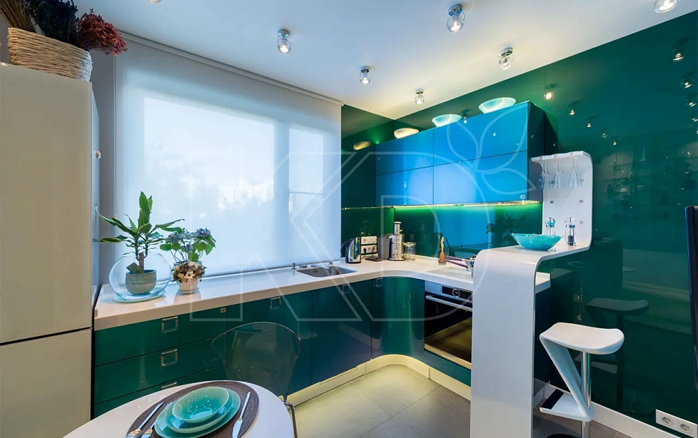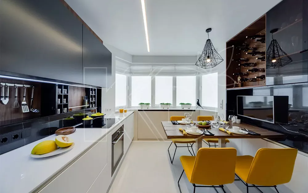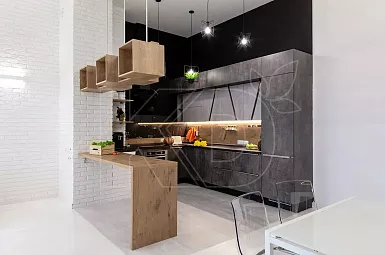 Барная стойка может использоваться в качестве дополнительной рабочей поверхности или обеденного стола. Другой плюс такой конструкции заключается в том, что она может использоваться для зонирования пространства.