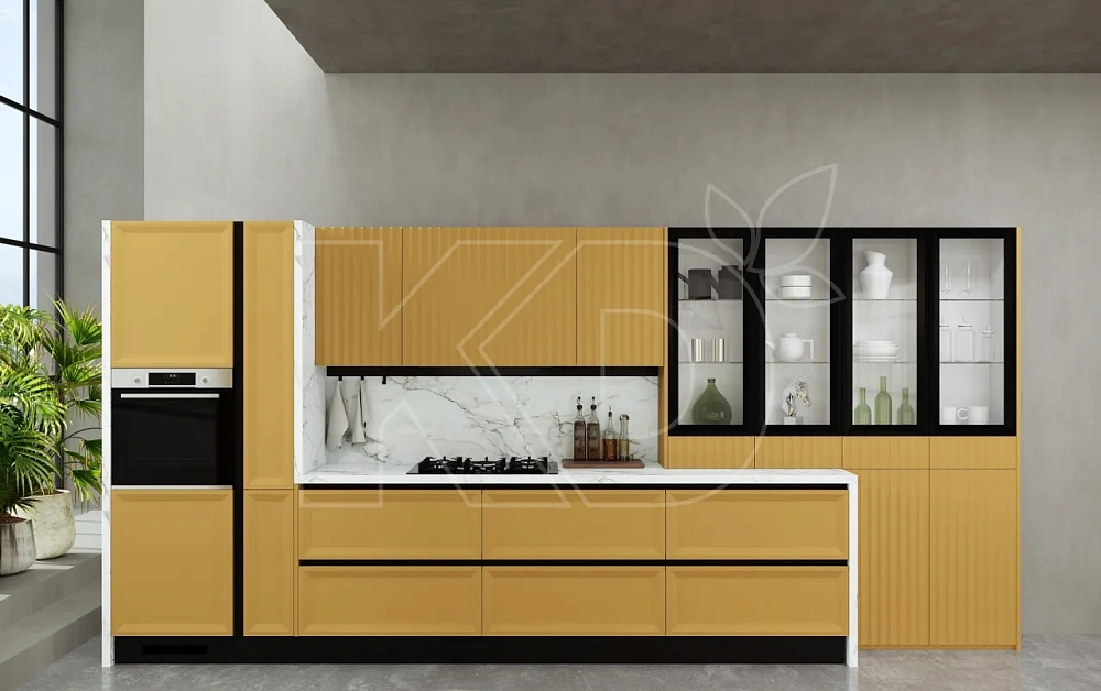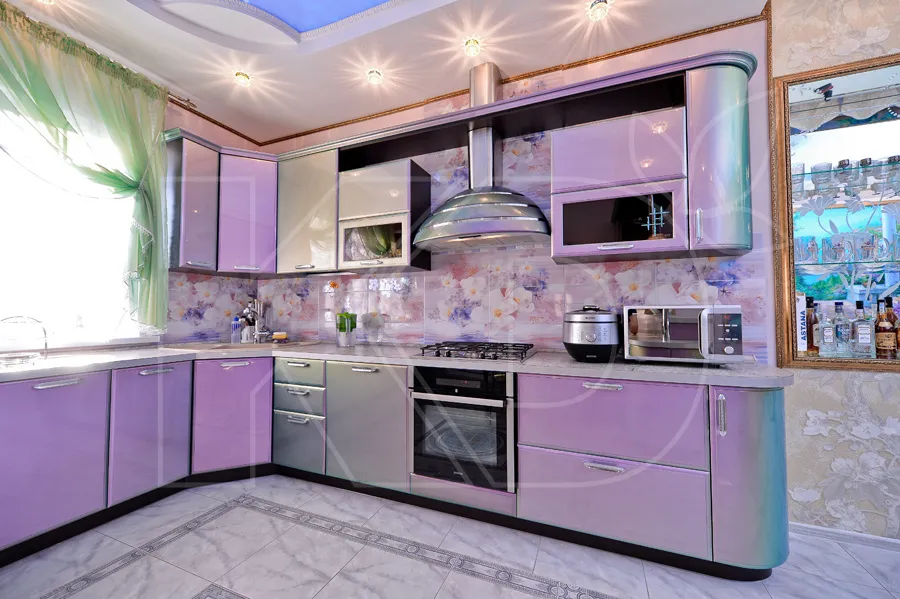 Гарнитур, в котором модули устанавливаются вдоль двух смежных стен, называется угловым. Подобная конфигурация позволяет рационально задействовать свободный угол. В него обычно встраивают шкаф или мойку.