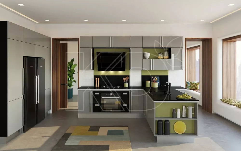 Планировка, при которой модули располагаются в виде буквы «П» вдоль трех смежных стен, обычно используется в больших помещениях. Подобное расположение считается одним из наиболее эргономичных, потому что позволяет придерживаться принципа рабочего треугольника. Холодильник, плита и мойка размещаются на одинаковом друг от друга расстоянии.