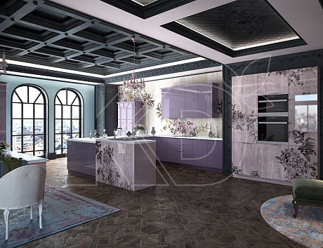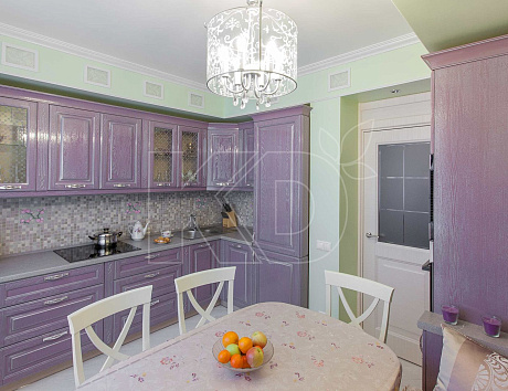 • В данной цветовой гамме выполняют также классические модели. Для них характерны четкие симметричные линии, роскошный декор. Серо-фиолетовая кухня в стиле классика обычно имеет мраморную или керамическую столешницу и изящную фурнитуру.
