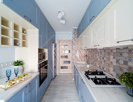 Чтобы синяя кухня в интерьере смотрелась максимально гармонично, необходимо тщательно продумать убранство помещения. Именно от этого зависит, насколько комфортно будет находиться в нем в дальнейшем. Так, для отделки стен в небольшом пространстве лучше выбрать светлую гамму в кремовых, бежевых или белых тонах. Наиболее подходящее решение – однотонные обои или плитка. Также приветствуются ненавязчивые абстрактные рисунки в виде едва заметных разводов или пятен. В просторной комнате больше возможностей для экспериментов. Поэтому синюю кухню в интерьере с большой площадью можно обыграть обоями с выраженными геометрическими узорами, изображениями флоры и фауны.