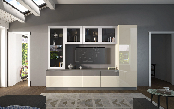 В части формы традиционные гарнитуры в одном уровне постепенно уходят в прошлое. Гораздо интереснее смотрится гостиная мебель под телевизор, предполагающая разную высоту у модулей. Симметрия при этом не обязательна.