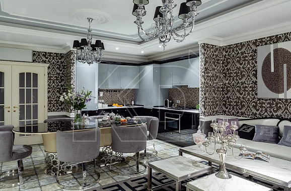 • Отделение зон. Благодаря угловой планировке рабочая и столовая зона оказываются в противоположных углах, что позволяет обыграть интерьер и сэкономить место в помещении.