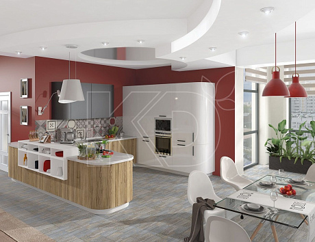 Все большую популярность приобретает кухонная мебель с радиусными фасадами. Подобные модели выглядят очень оригинально и эстетично, а отсутствие углов делает их безопасными для детей.