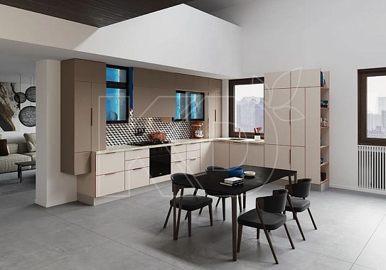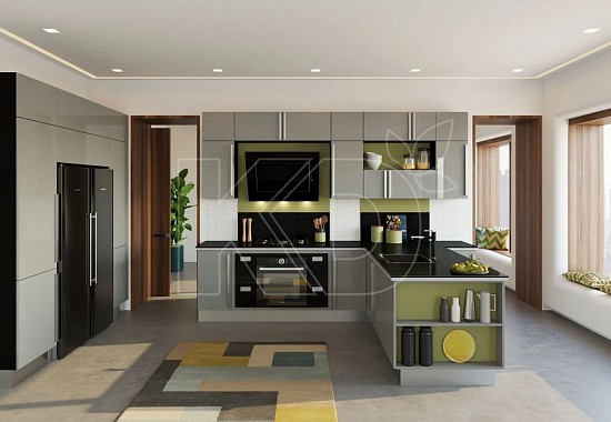 • Угловую кухню с островом. Для квартир-студий или домов, где кухня совмещена со столовой или гостиной, это удобный формат, не только сохраняющий функциональность, но и выполняющий задачи зонирования помещения. Остров может использоваться как дополнительная рабочая поверхность или как место для размещения бытовой техники.