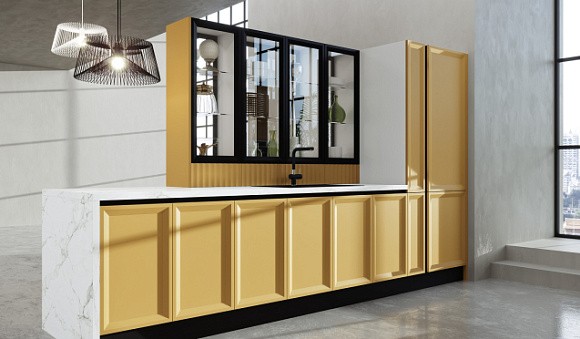 Классические гарнитуры выпускают в приглушенных оттенках – горчичном, светло-желтом, песочном. Золотистые элементы могут использоваться для декоративной отделки фасадов. Пространство, в котором будет находиться желтая кухня классика, следует оформить подобающе. Выбрать качественные обои для отделки стен, на окна повесить плотные шторы. Особое внимание следует уделить подсветке. Так, точечным светильникам необходимо предпочесть роскошную люстру.
