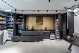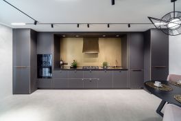 Мы сотворили кухню, соединившую в себе элегантность, функциональность и нестандартные дизайнерские решения. За основу была взята уже полюбившаяся всем новинка, «Ханна Стил». Ее бархатистые фасады «Extra Touch Matt» с контрастными золотыми кромками великолепно смотрятся в просторном помещении! Красота «Ханны» неоспорима, равно как и удобство. В этом проекте дизайнеры «KD-Lab» сделали ставку на строгую, симметричную архитектуру. В центре композиции – уникальная вытяжка нестандартной формы, которая выводит «Ханну» в эпицентр всеобщего внимания. Кстати, цвет вытяжки, фартука, ручек и смесителя перекликается с цветом кромок, благодаря чему облик модели выглядит цельным и завершенным.